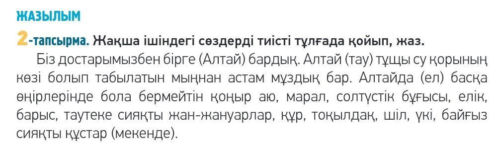 Ответ: 1. Алтайға бардық.2. Алтай тауы.3. Алтай елінде.4. Құстар мекендейді