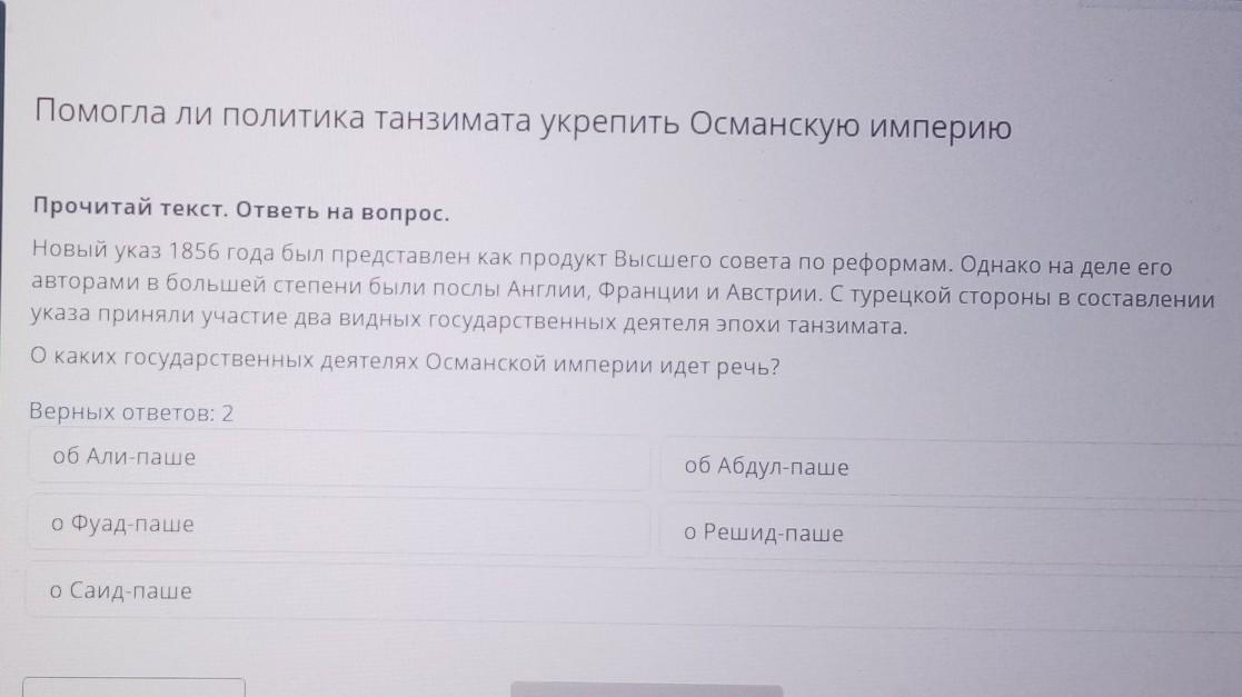 Пжж помогите даю 20 баллов!!?? Прочитай текст. Ответы на вопрос. Новый указ 1856 года был представлен как продукт Высшего совета по реформам. Однако на деле его авторами в большей степени были послы Англии, Франции и Австрии. С турецкой стороны в составлении указа приняли участие два видных государственных деятеля эпохи танзимата, О каких государственных деятелях Османской империи идет речь? Верных ответов: 2 об Али-паше об Абдул-Гаше о Фуад-паше о Решид-паше o Саид-паше