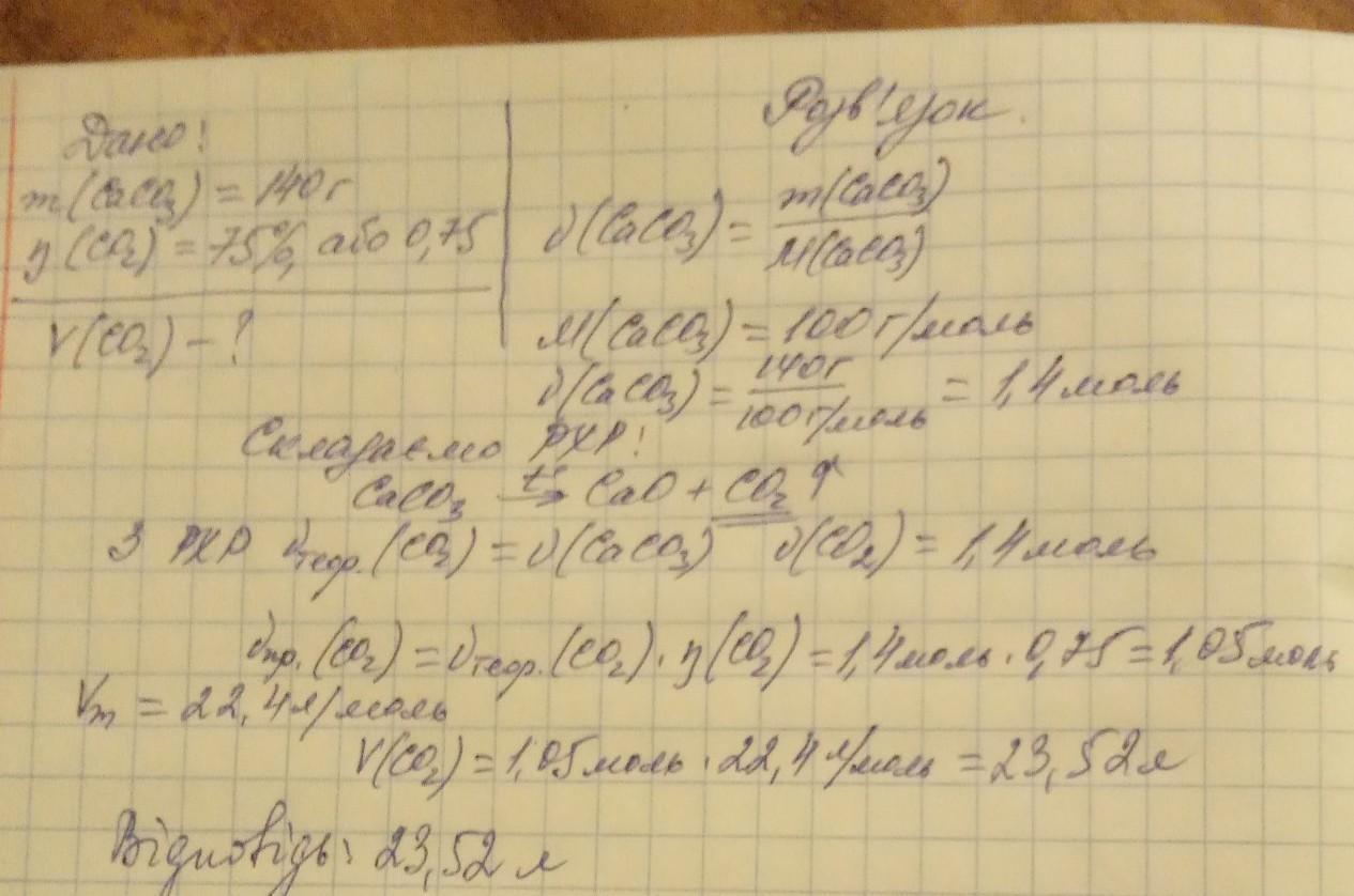Який об'єм вуглекислого газу утвориться при термічному розкладаннi 140 г кальцiй карбонату, якщо вихід продукту реакції становить 75%? Бажано, з повним розв'язком