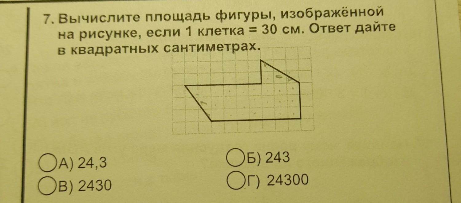 Вычислите площадь фигуры, изображённой на рисунке, если 1 клетка = 30 см. Ответ дайте в квадратных сантиметрах.