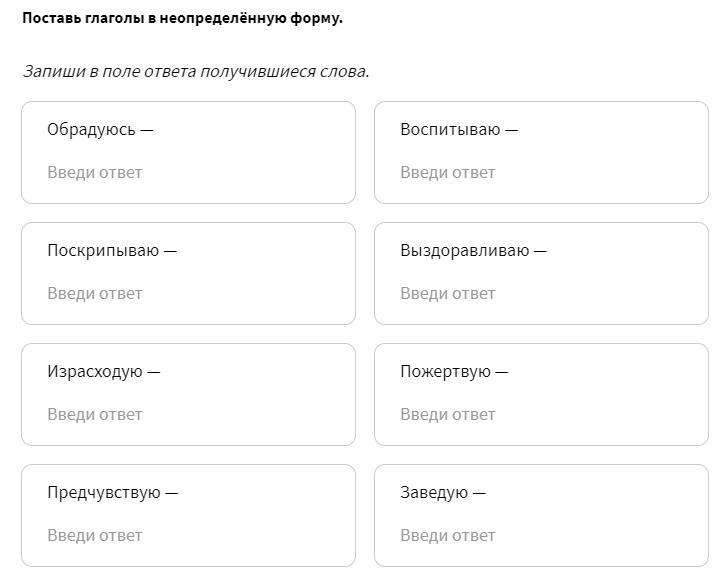 обрадоваться, поскрипывать, израсходовать, предчувствовать, воспитывать, выздоравливать, пожертвовать, заведовать.