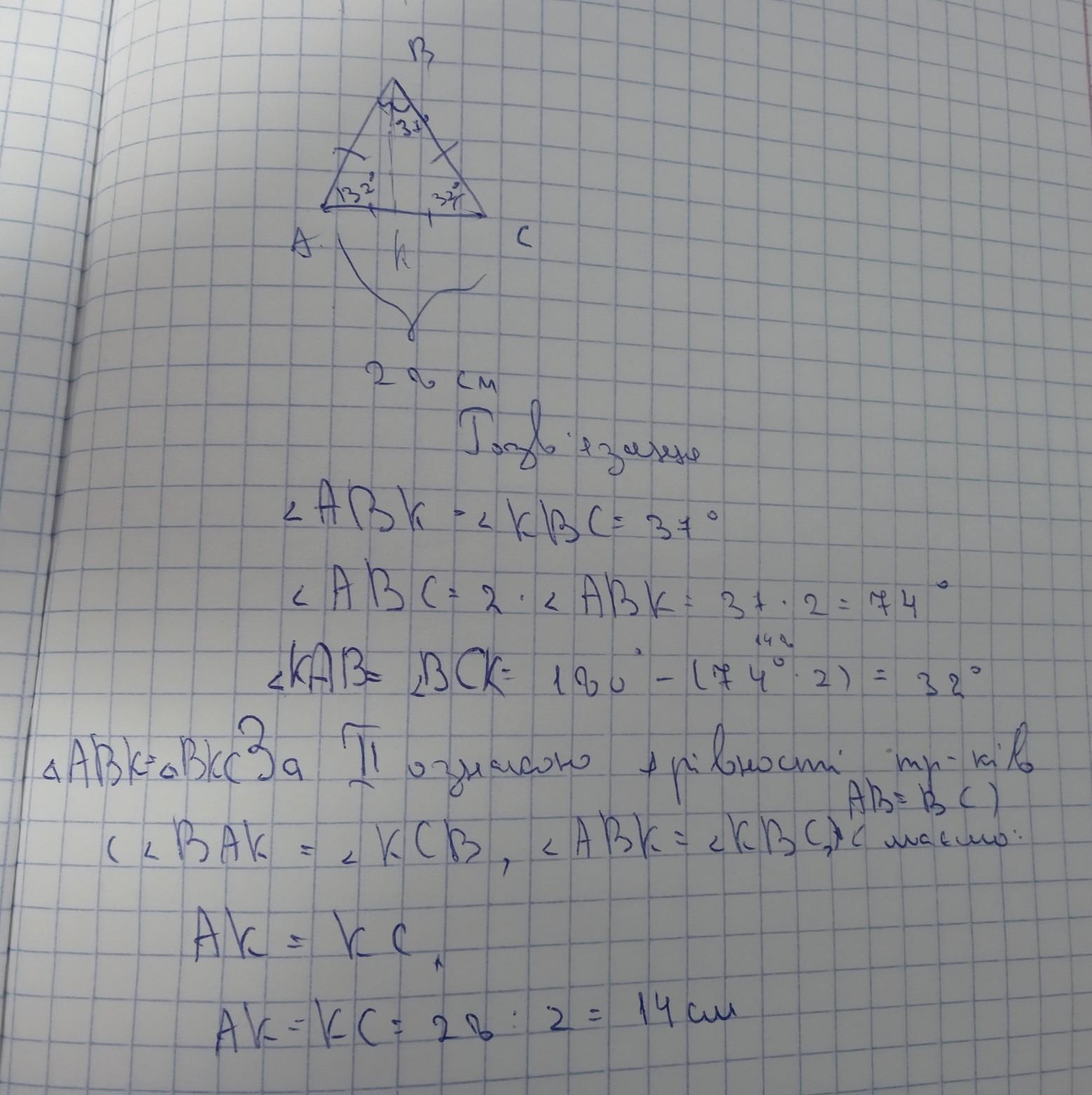 Відрізок BK є бісектрисою рівнобедреного трикутника АВС(АВ=ВС),<СВК=37°,АС=28см.Знайдіть<КАВ,<АВС та відрізок АК