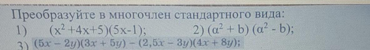 \displaystyle 1)(x^2+4x+5)(5x-1)=x^2(5x-1)+4x(5x-1)+5(5x-1)=\\ \\ 5x^3-x^2+20x^2-4x+25x-5=5x^3+19x^2+21x-5\\\\ 2)(a^2+b)(a^2-b)=(a^2)^2-b^2=a^4-b^2\\\\ 3)(5x-2y)(3x+5y)-(2,5x-3y)(4x+8y)=\\ \\ 15x^2+25xy-6xy-10y^2-(10x^2+20xy-12xy-24y^2)=\\ \\ 15x^2+25xy-6xy-10y^2-(10x^2+8xy-24y^2)=\\ \\ 15x^2+25xy-6xy-10y^2-10x^2-8xy+24y^2=5x^2+11xy+14y^2