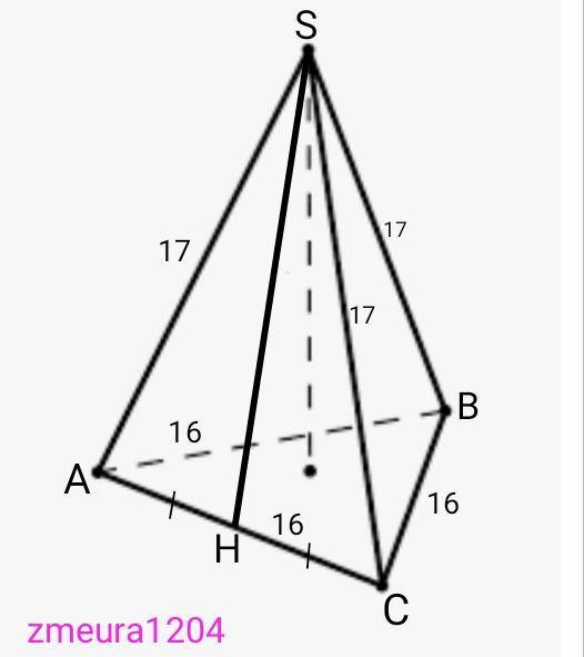 Сторона основи правильної трикутної піраміди дорівнює 16 см, а бічне ребро 17 см. Знайдіть площу бічної поверхні піраміди. Даю багато балів!!!