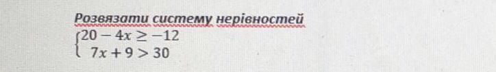 \displaystyle\bf\\\left \{ {{20-4x\geq -12} \atop {7x+9>30}} \right. \\\\\\\left \{ {{-4x\geq -12-20} \atop {7x>30-9}} \right. \\\\\\\left \{ {{-4x\geq -32} \atop {7x>21}} \right.\\\\\\\left \{ {{x\leq 8} \atop {x>3}} \right. \\\\\\Otvet:x\in\Big(3 \ ; \ 8\Big]