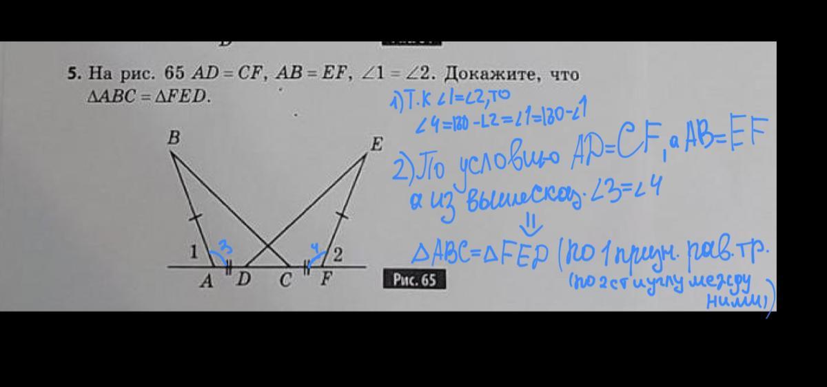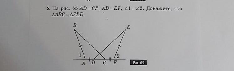На рис. 65 AD=CF, AB=EF, угол 1=угол 2. Докажите что треугольник ABC= треугольнику FED.