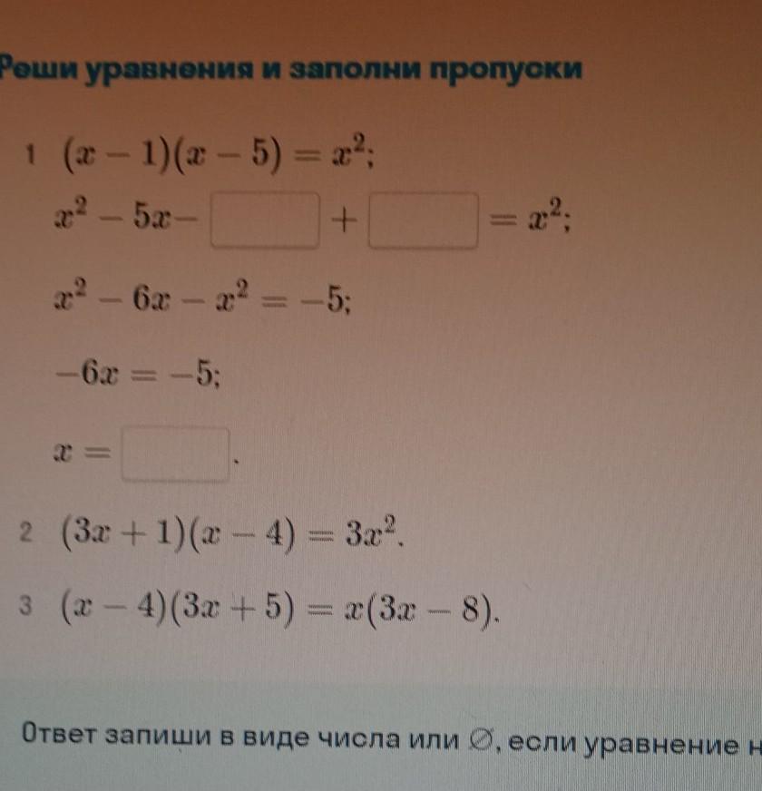 \displaystyle 1)(x-1)(x-5)=x^2\\x^2-5x-x+5=x^2\\-5x-x+5=0\\-6x+5=0\\-6x=-5\\\\ x=\frac{5}{6}\\\\ 2)(3x+1)(x-4)=3x^2\\3x^2-12x+x-4=3x^2\\-12x+x-4=0\\-11x-4=0\\-11x=4\\\\ x=-\frac{4}{11}\\\\ 3)(x-4)(3x+5)=x(3x-8)\\3x^2+5x-12x-20=3x^2-8x\\5x-12x-20=-8x\\-7x-20=-8x\\-7x+8x=20\\x=20