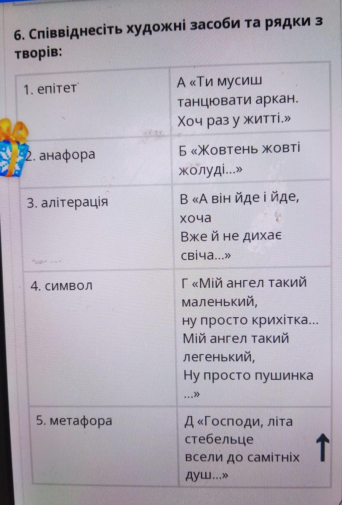 6. Співвіднесіть художні засоби та рядки з творів: 1. епітет A«Ти мусиш танцювати аркан. Хоч раз у житті.» 2. анафора Б«Жовтень Жовті жолуді...» 3. алітерація В «А він йде і йде, хоча Вже й не дихає. Свіча...» 4. Символ Г«Мій ангел такий маленький, ну просто крихітка... Мій ангел такий легенький, Ну просто пушинка 5. метафора Д«Господи, літа стебельце всели до самітніх душ...» т