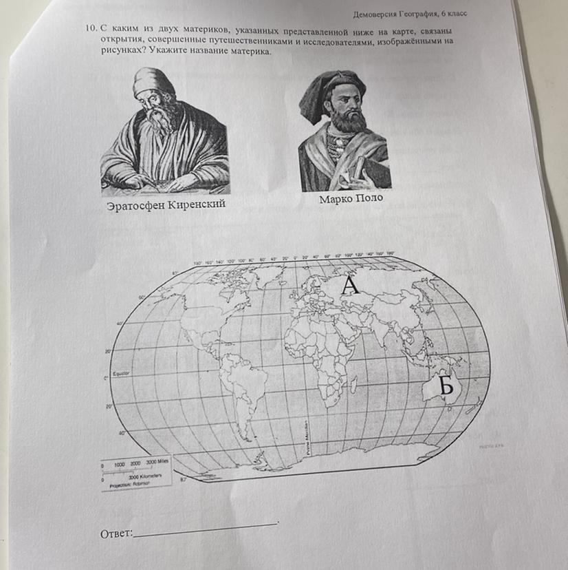 Материк Евразия (А), т. к. Эратосфен и Марко Поло изучали территории Евразии;