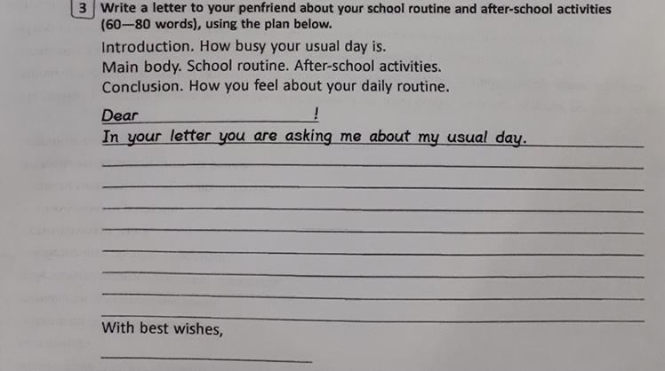 Dear (имя твоей подруги на английском)! In your letter you are asking me about my usual day. (Пишешь как проходит свой день, можешь через переводчик просто я не знаю как ты его проводишь)