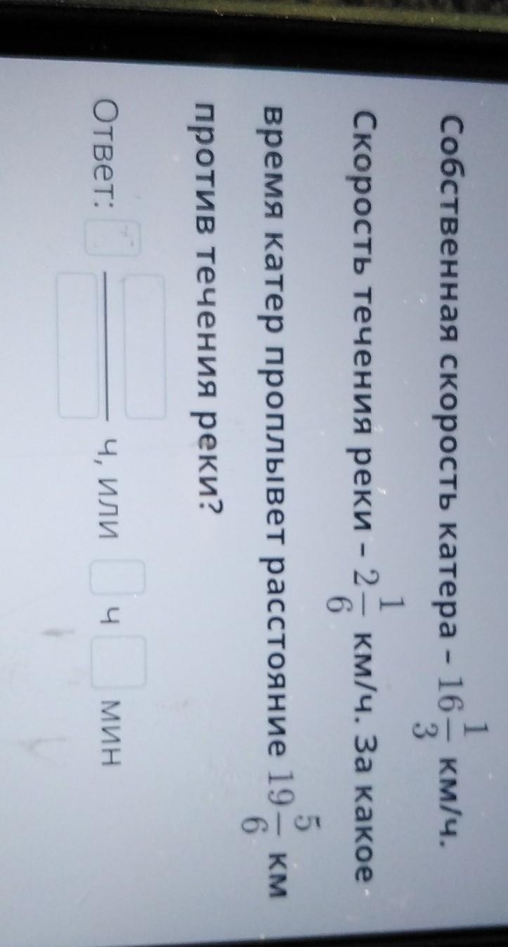 1 Собственная скорость катера - 16 км/ч. 3 1 Скорость течения реки - 2 км/ч. За какое 6 5 время катер проплывет расстояние 19 KM 6 против течения реки? Ответ: Ч, ИЛИ МИН ПОМОГИТЕ ПОЖАЛУЙСТА дам 30 баллов