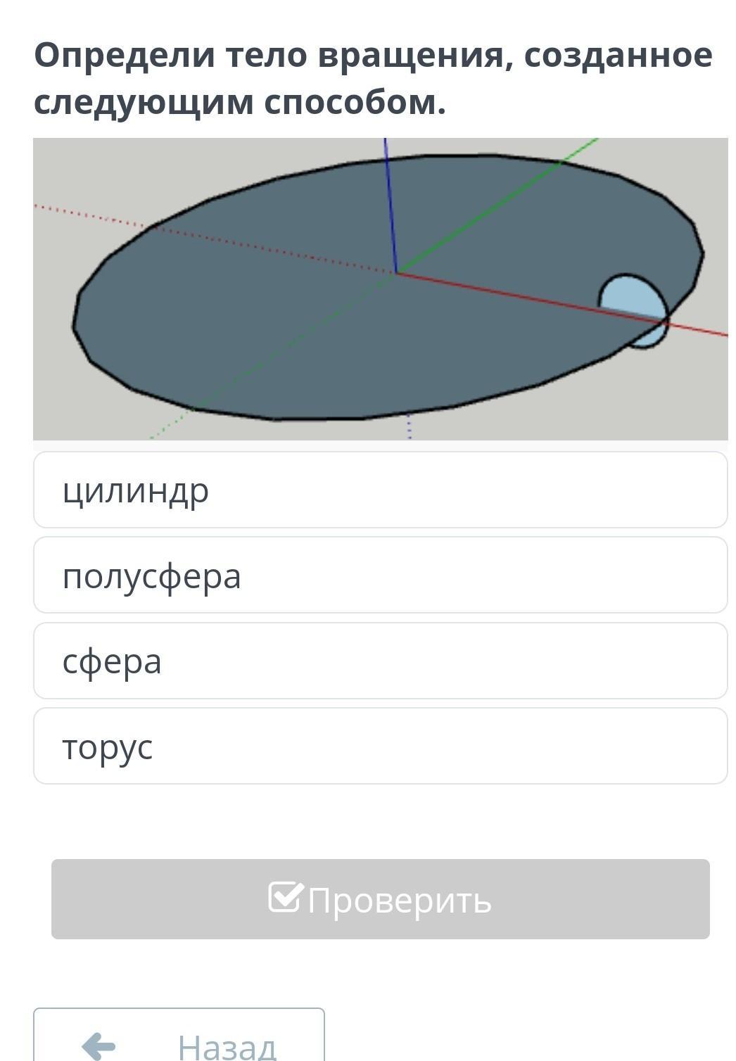 3D-модели объектов. Урок 4 Определи тело вращения, созданное следующим способом.  цилиндр полусфера сфера торус Назад Проверить