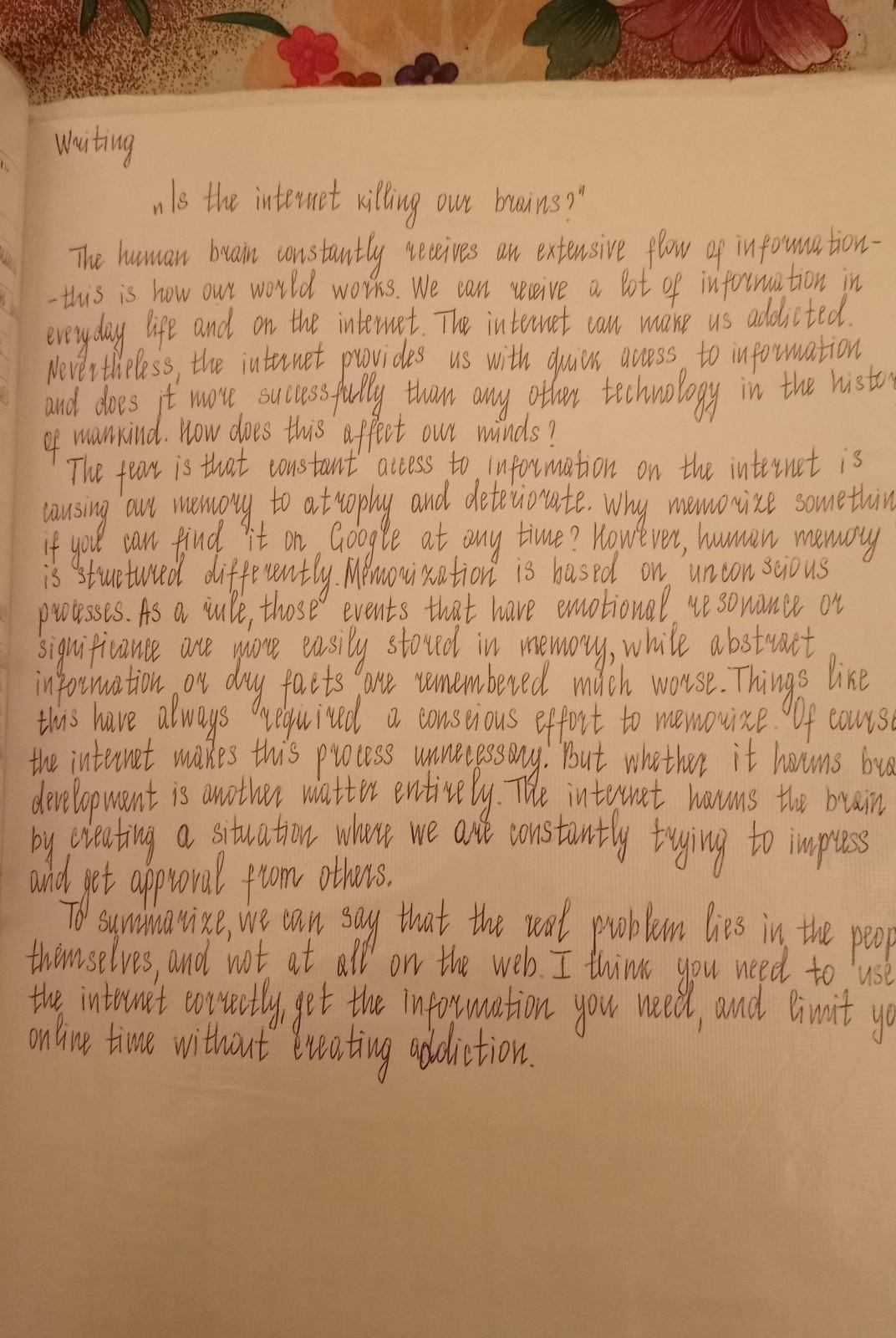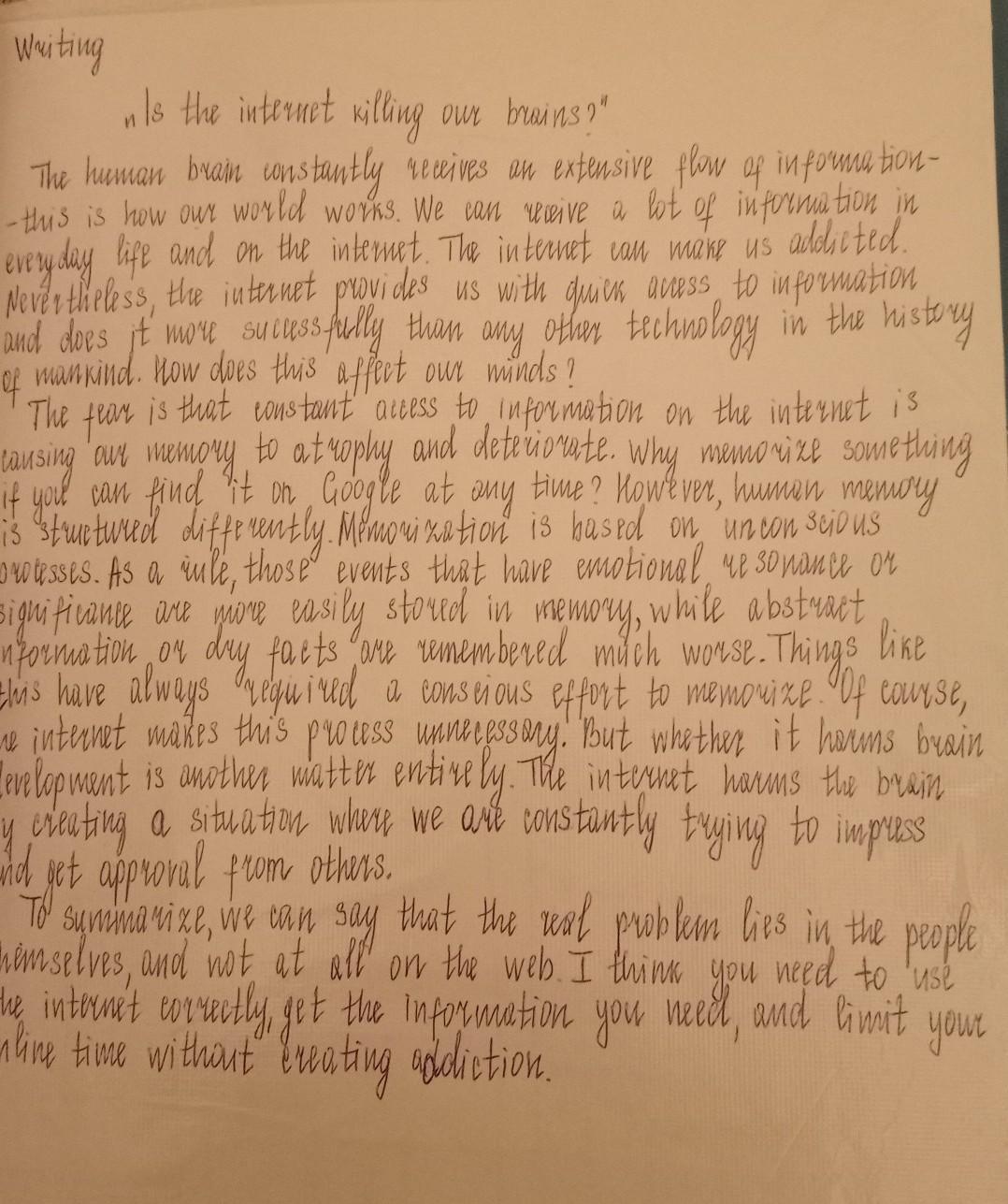 The human brain constantly receives an extensive flow of information-this is how our world works.We can receive a lot of information in everyday life and on the internet.The internet can make us addicted.Nevertheless,the internet provides us with quick access to information and does it more successfully than any other technology in the history of mankind. How does this affect our minds?