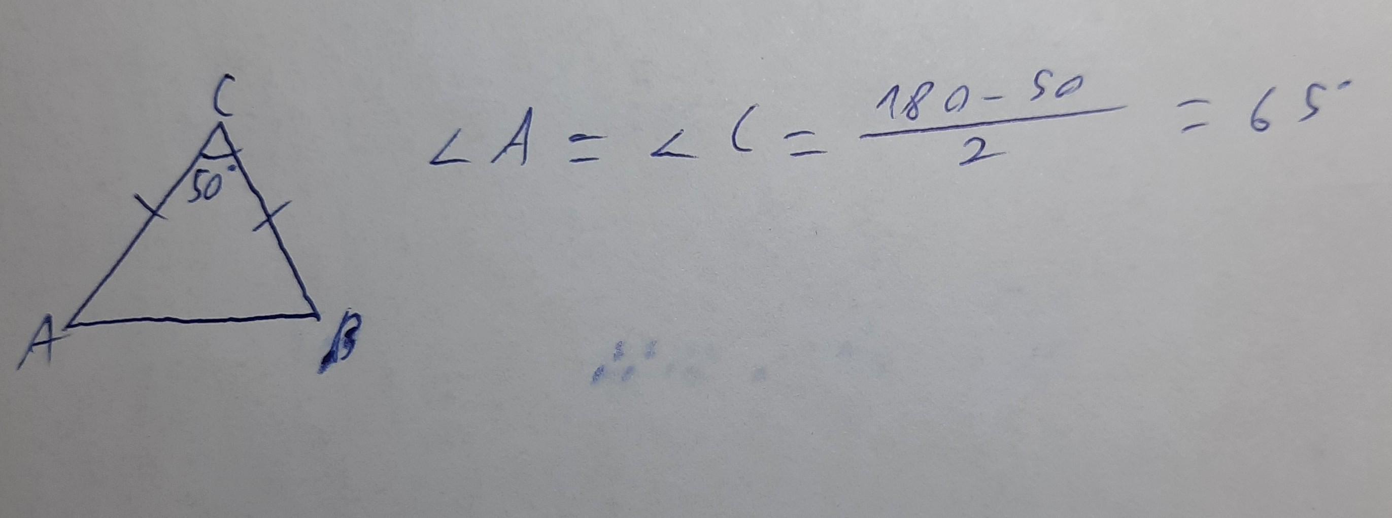 5.) АВ основание равнобедренного треугольника ABC. С = 50градусов . найдите остальные углы треугольника, если сумма всех углов равна 180 градусов