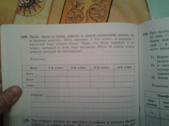 Петя,Ваня и Саша учатся в одной начальной школе, но в разных классах. Петя перешёл в тот класс, в котором в прошлом году учился Саша. Через год Ваня перейдёт в тот класс,который в этом году закончит Петя. В каком классе учится каждый из мальчиков?