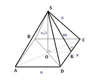 где Р - периметр основания, Р=4а, m-апофема (опущенный перпендикуляр SK из вершины S, на ребро основания DC)