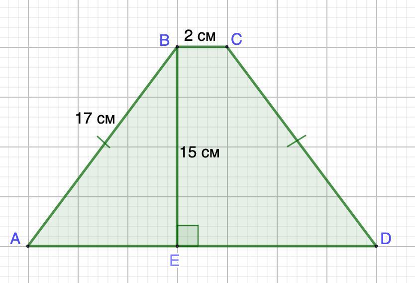 в равнобедренной трапеции боковая сторона 17 см меньшее основание 2 см а высота равна 15 см найдите площадь трапеции