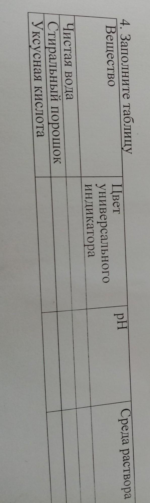 4. Заполните таблицу Вещество pH Среда раствора Цвет универсального Индикатора Чистая вода Стиральный порошок Уксусная кислота