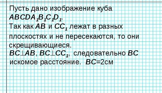 Дан куб abcda1b1c1d1 ребро которого равно2 см. Найдите расстояние между прямыми ab и cc1