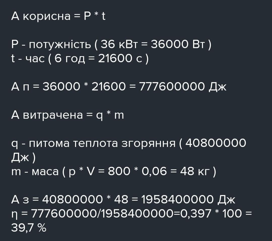 Двигун потужністю 36 кВт за 6 годин роботи витратив 60 л гасу. Яким є ККД двигуна ? Густина гасу 800 кг/м питома теплота згоряння гасу 46 МДж/кг.