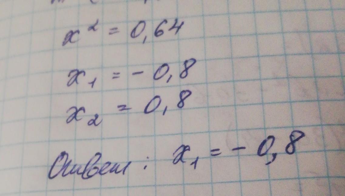 4. Решите уравнение х2 = 0,64. Если уравнение имеет несколько корней, то в ответе запишите наименьший.