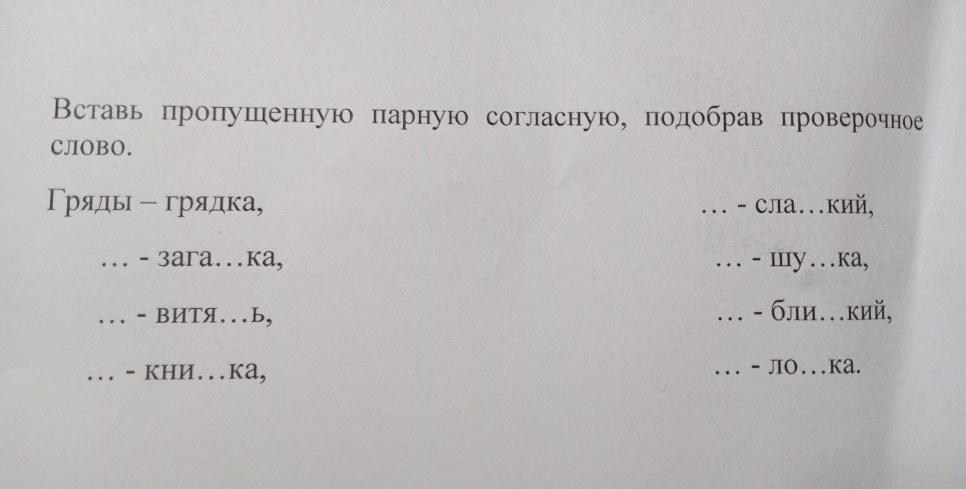 Вставь пропущенную парную согласную, подобрав проверочное слово. Гряды — грядка, ... - сла...кий, ... - зага...ка, .. - шу...ка, ... - Витя...ь, ... - бли...кий, ... - Кни...ка, ... - ло...ка.