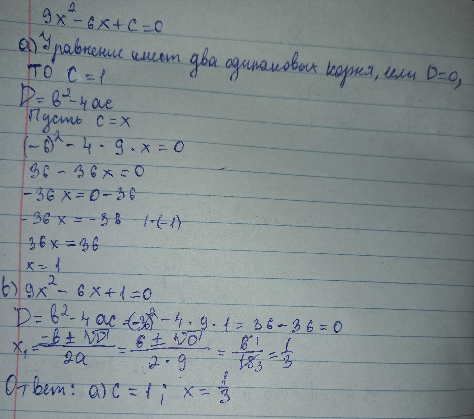 3. Дано квадратное уравнение 9х²- 6х+с= 0.