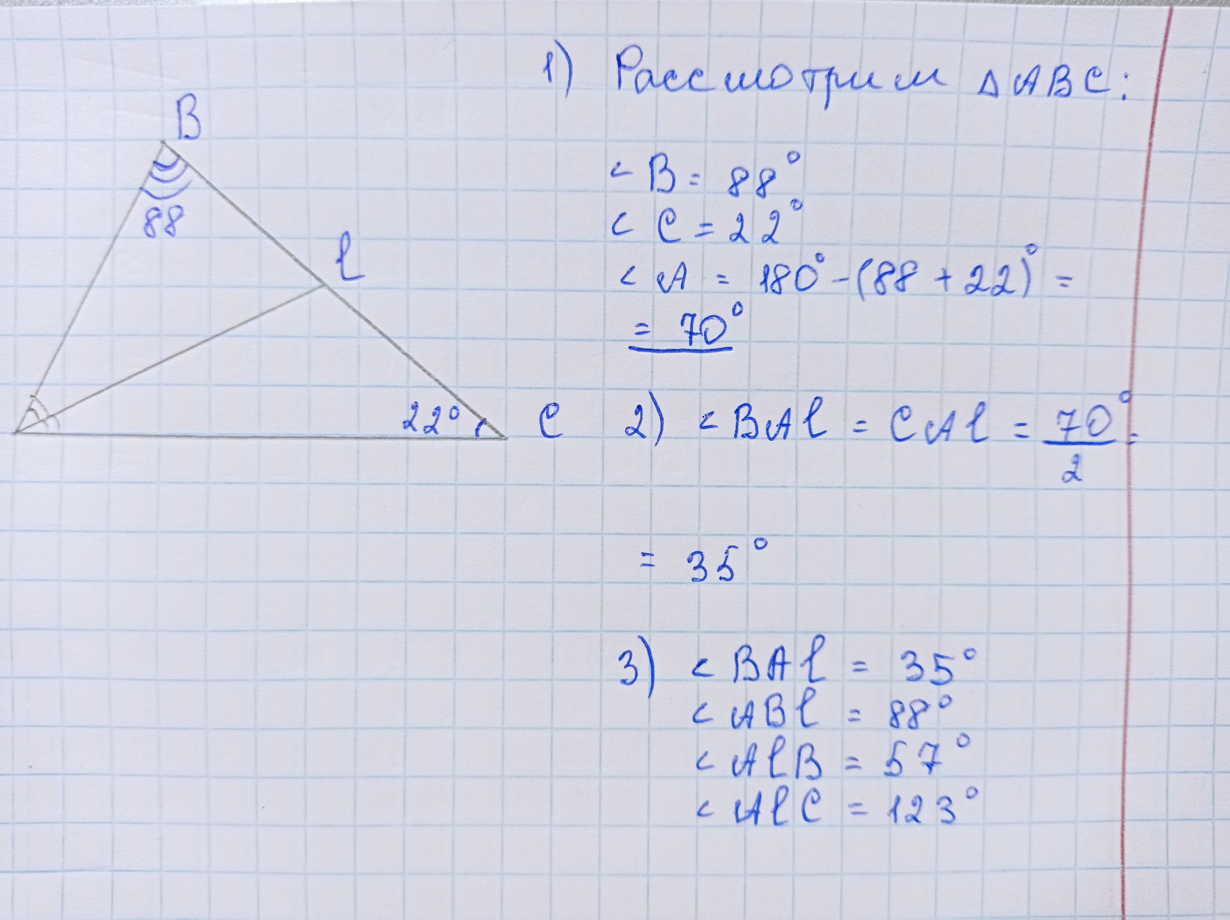 в треугольнике abc проведена биссектриса al угол bca равен 22° а угол abc равен 88° чему будет равен abl?