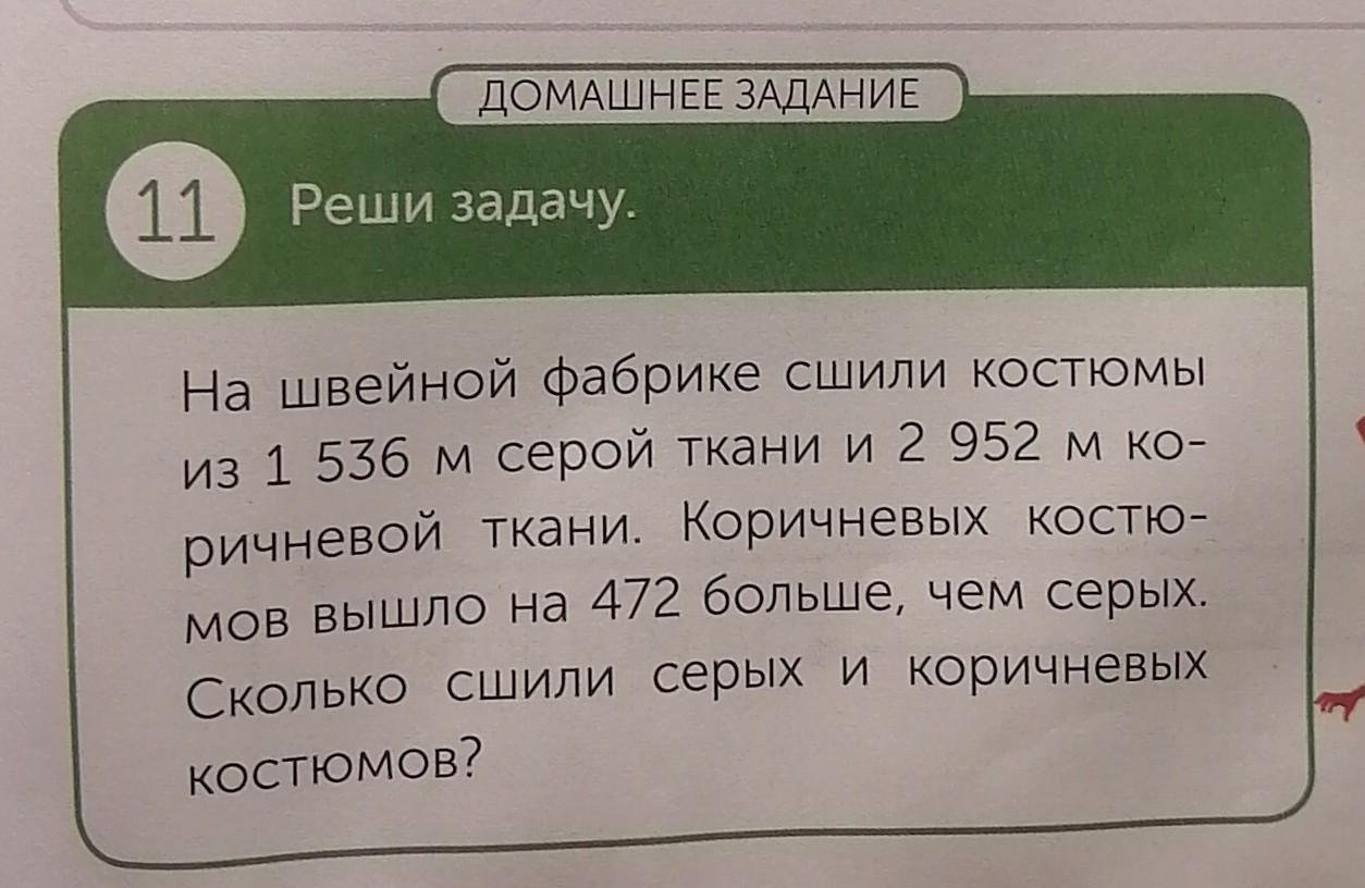 11 Реши задачу. На швейной фабрике сшили костюмы из 1 536 м серой ткани и 2 952 мко- ричневой ткани.Коричневых костю- мов вышло на 472 больше, чем серых. Сколько сшили серых и коричневых Костюмов?С УСЛОВИЕМ!!!!!!!!!! ПОЖАЛУЙСТА ПОМОГИТЕ ПОЖАЛУЙСТА МНЕ