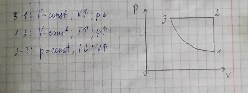 Процесс 3-1 является изотермическим расширением, здесь не меняется температура, объем растет, а давление уменьшается (по закону Бойля-Мариотта).