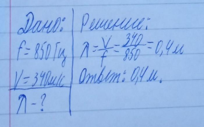 Звукова хвиля поширюється в повітрі з частотою 850 Гц. Яка до- вжина хвилі, якщо швидкість звуку в повітрі дорівнює 340 ч.