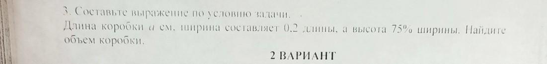 составьте выражение по условию задачи. Длинна коробки а см . ширина коробки 0.2 длинны. а высота 75% ширины. найдите объем коробки.