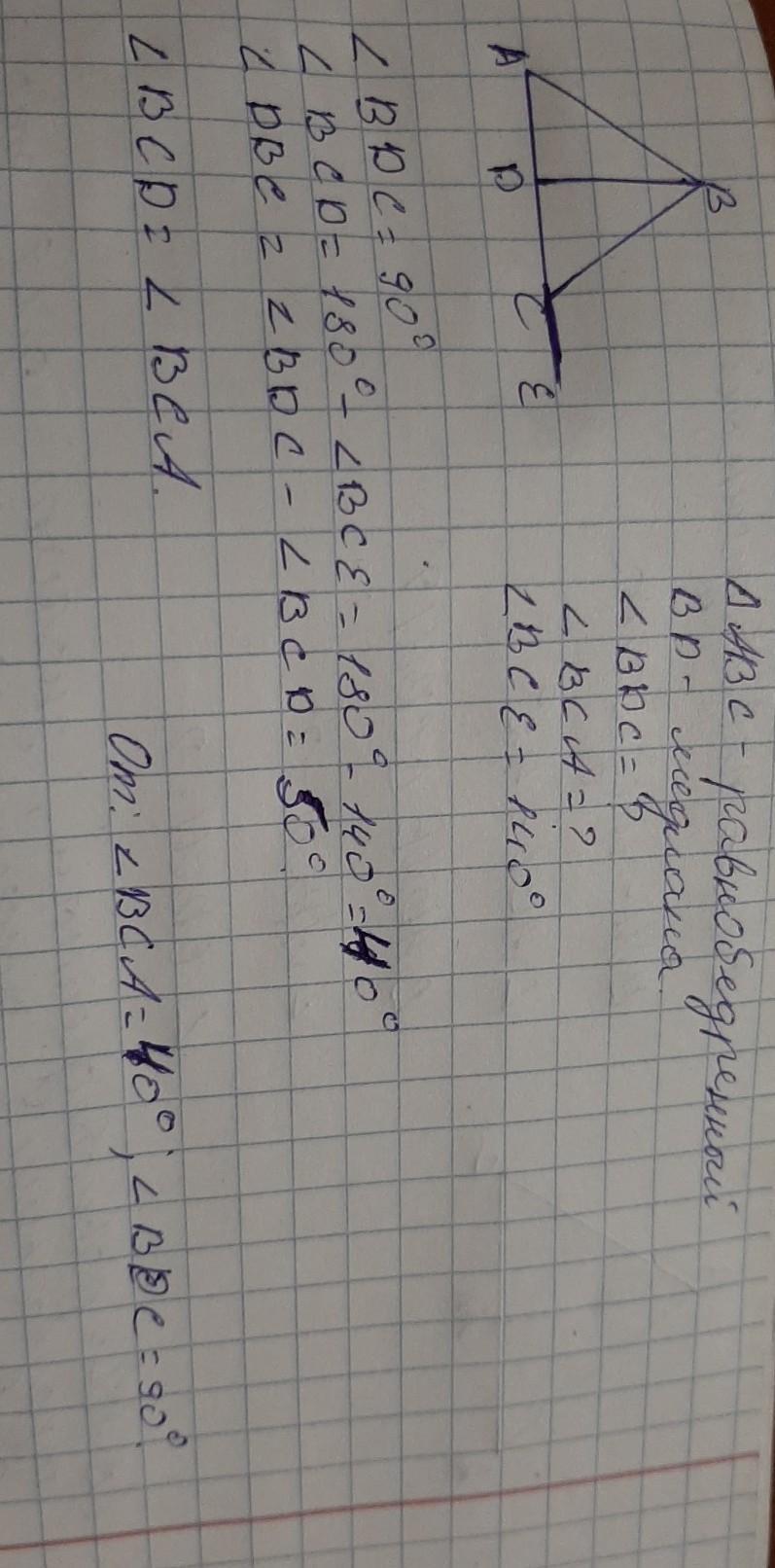 В равнобедренном треугольнике АВС с основанием АС проведена медиана BD. Найдите градусные меры углов BDC и BCA, если внешний угол при основании равен 1400