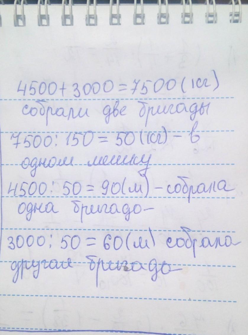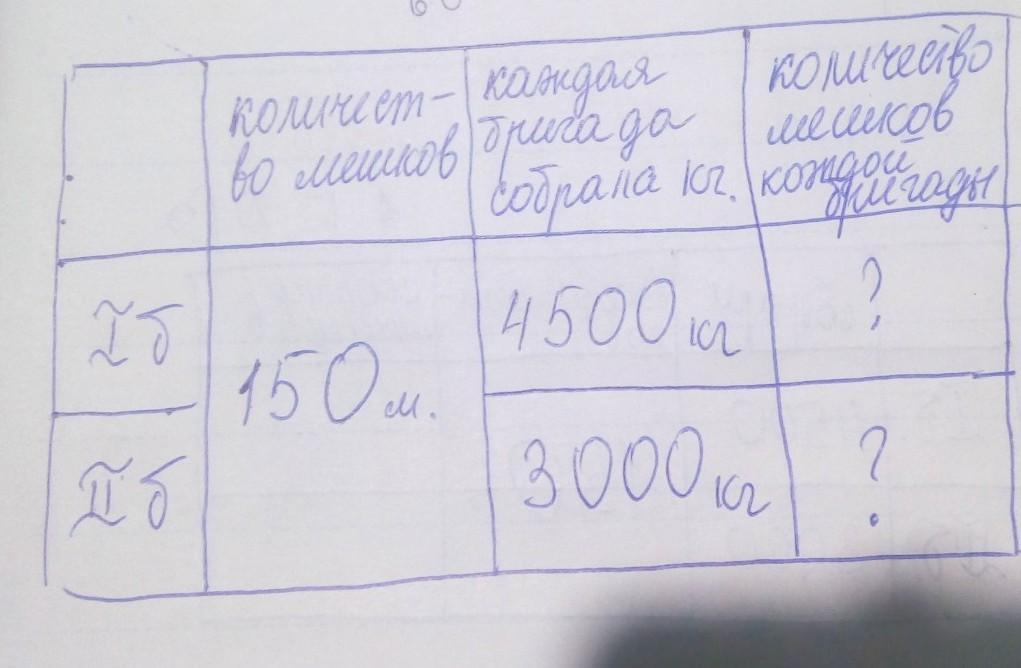 РАБОТА В ПАРЕ 4 Реши задачу. Две бригады собрали 150 одинаковых мешков картофеля, причём одна собрала 4 500 кг, а другая – 3 000 кг. Сколько мешков картофеля собрала каждая бригада?