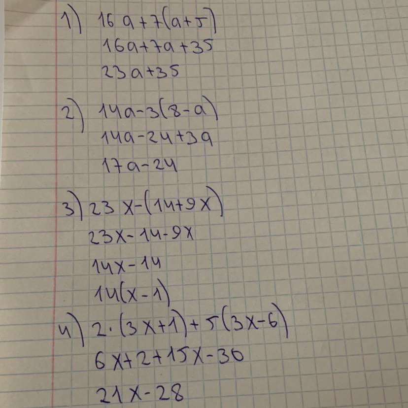 1. Упрости выражения: а) 16а +7(a+5) б) 14а- 3 (8-а) в) 23х - (14 + 9x) г) 2 (3x +1) +5 (3x-6) д) 8x – (3,7х – 2)+(1,2-5x) [6