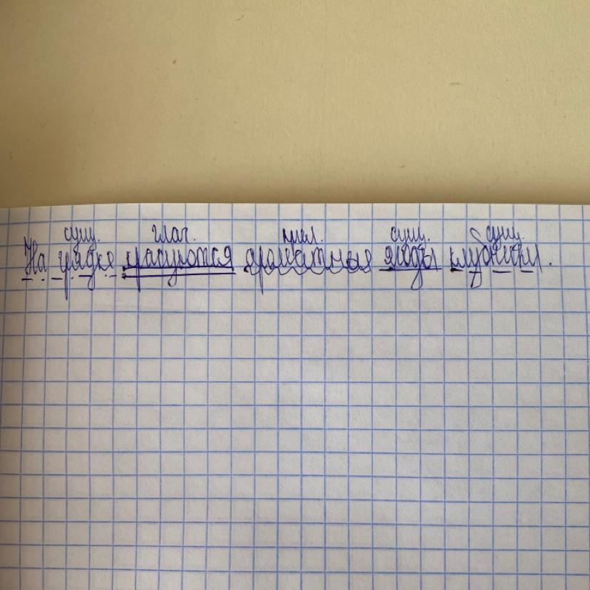 Лето замечательная пора. Поспевает в саду уро- жай. На грядке красуются ароматные ягоды клубни, ки. Они сами в рот просятся. Созрели, вкусные гроз- Дья белой, красной, чёрной смородины. У-изгороди под тяжестью согнулись колючие ветки малины. На них висят крупные ягоды. Сочная вишня уже пожелте- ла. Подлетел воробей к ней. Ему не терпится отведать ягод. Налились яблоки. А сколько цветов! Вот пёстрые гвоздики, нарядные анютины глазки. До поздней осе- ни будут цвести астры. Летом сад всех к себе манит. Выписать третье предложение, разобрать его по членам предложения, указать части речи