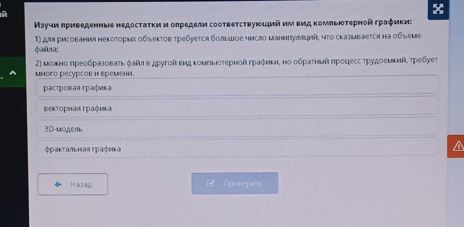Изучи приведенные недостатки и определи соответствующий им вид компьютерной графики: 1) для рисования некоторых объектов требуется большое число манипуляций, что сказывается на объеме файла; 2) можно преобразовать файл в другой вид компьютерной графики, но обратный процесс трудоемкий, требует много ресурсов и времени. растровая графика векторная графика 3D-модель фрактальная графика