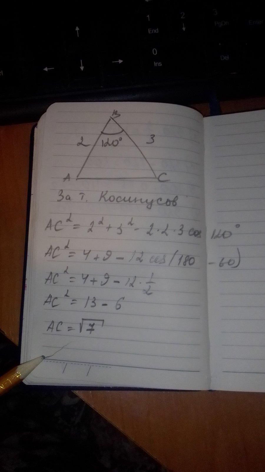 Вычисли третью сторону треугольника, если две его стороны соответственно равны 2 см и 3 см, а угол между ними равен 120°.