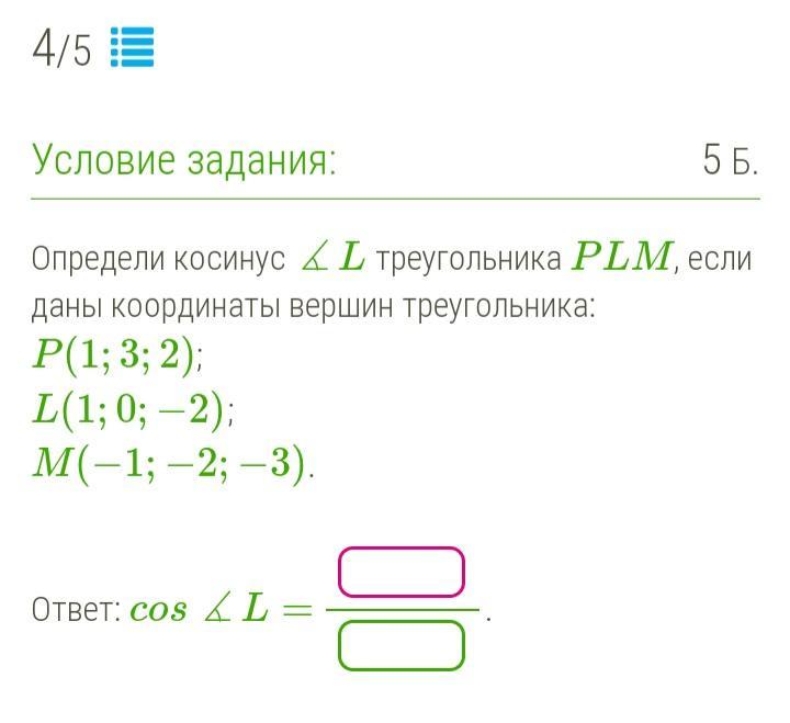 Определи косинус ∡L треугольника PLM, если даны координаты вершин треугольника: