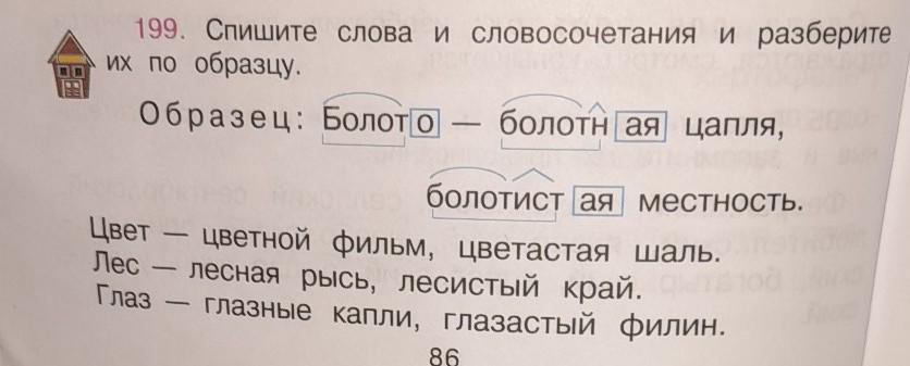 199. Спишите слова и словосочетания и разберите их по образцу. Образец: Болото болотная цапля, болотист (ая местность, Цвет цветной фильм, цветастая шаль. Лес — лесная рысь, лесистый край. Глаз - - глазные капли, глазастый филин.