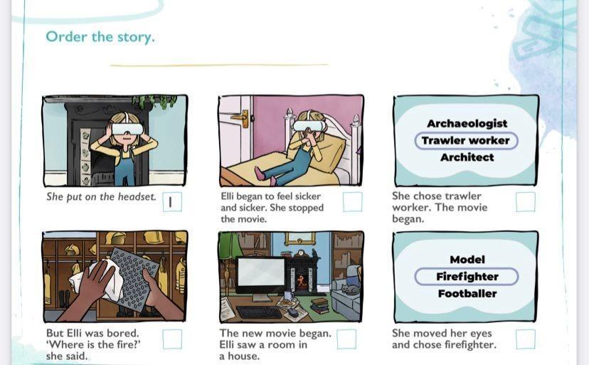 Ответ: 2- she chose trawler worker... 3- Elli began to feel sicker and sicker...4- She moved her eyes and chose firefighter. 5- The new movie began...6- But Elli was bored