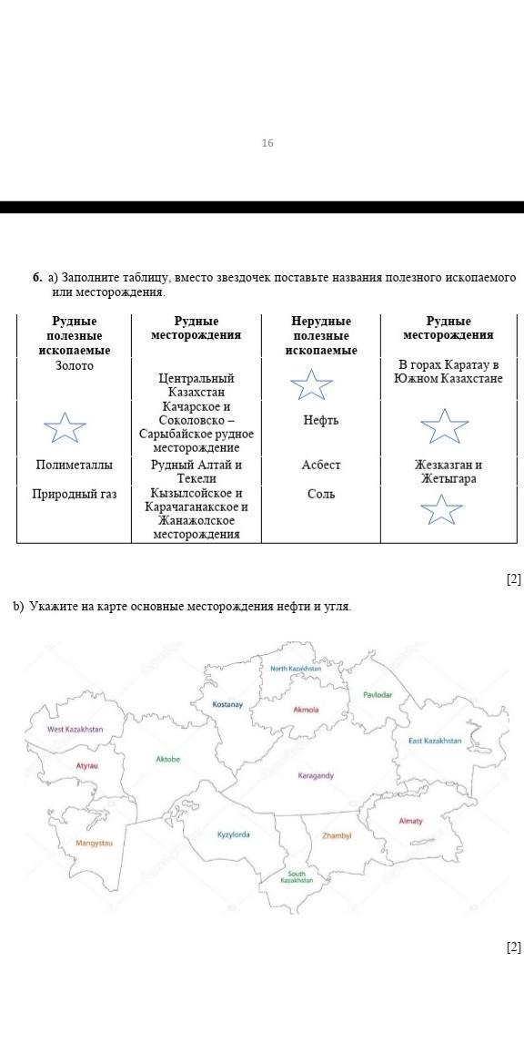Я не могу по второму разу написать ответ но месторождение нефти-Атырауская обл. месторождение угля:Карагандинской область