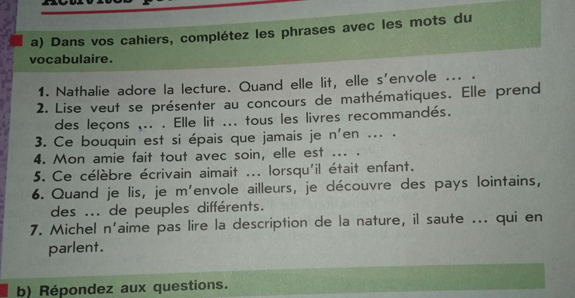 Dans vos cahiers, complétez les phrases avec les mots du vocabulaire. 1. Nathalie adore la lecture. Quand elle lit, elle s'envole 2. Lise veut se présenter au concours de mathématiques. Elle prend des leçons Elle lit... tous les livres recommandés. 3. Ce bouquin est si épais que jamais je n'en 4. Mon amie fait tout avec soin, elle est 5. Ce célèbre écrivain aimait lorsqu'il était enfant. 6. Quand je lis, je m'envole ailleurs, je découvre des pays lointains, des ... de peuples différents. 7. Michel n'aime pas lire la description de la nature, il saute ... qui en parlent.