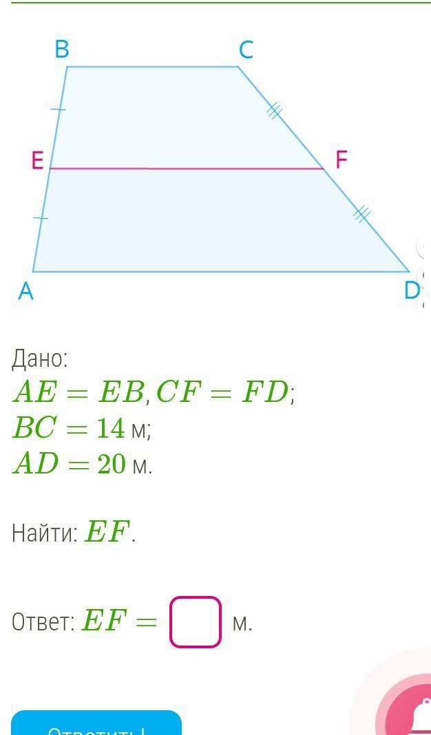 Так как AE=EB и CF=FD, то EF - средняя линия по определению. Имеем, что EF = (BC+AD)\2= (14+20)\2=17c\2=8,5 (м)