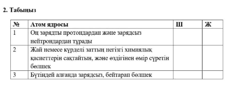 Оң зарядты протондардан және зарядсыз нейтрондардан тұрады. Ш(Шындық)