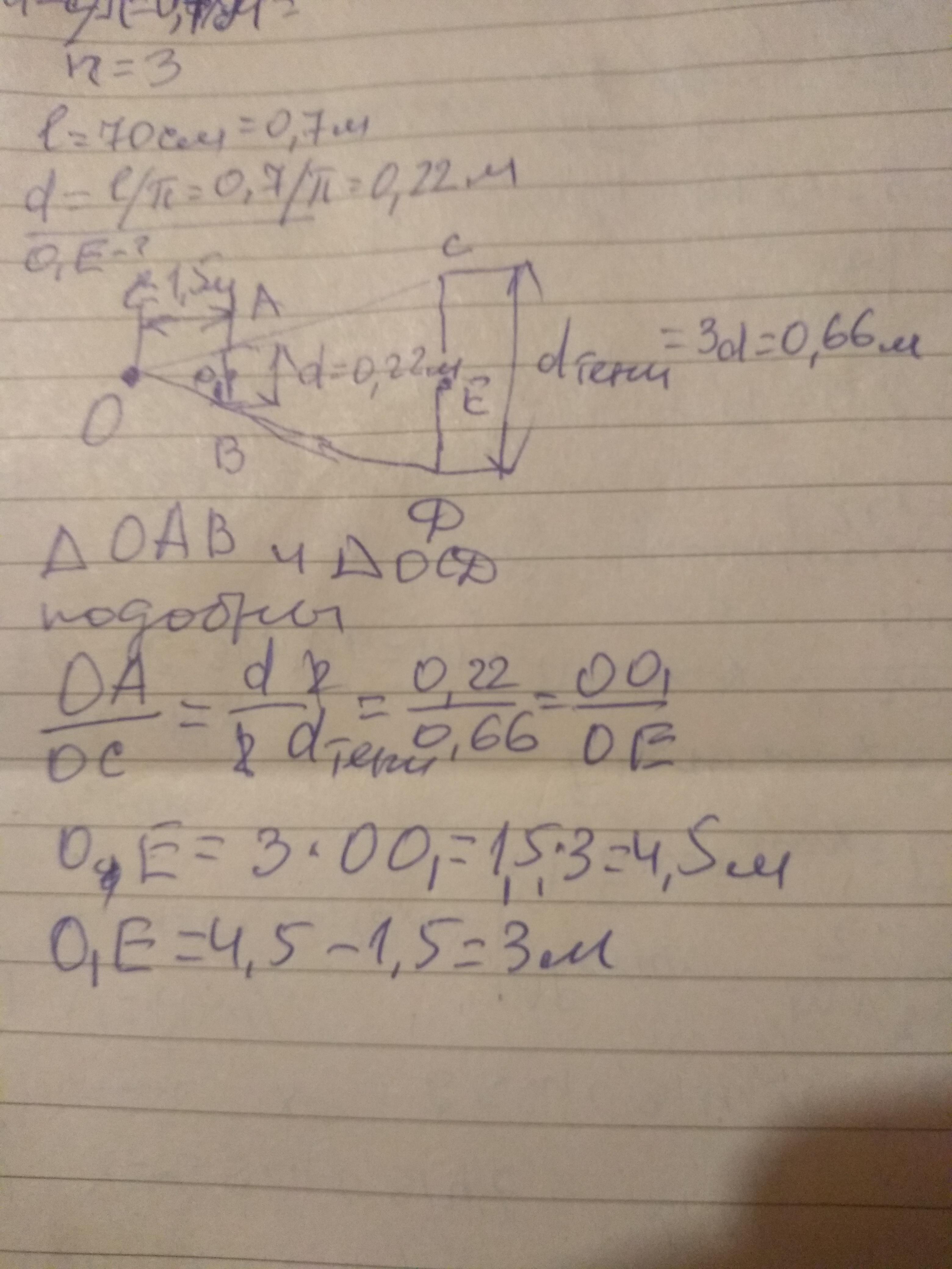 Футбольный мяч имеет длину окружности 70 см и находится от лампочки на расстоянии 1,5 м. На каком расстоянии необходимо расположить мяч от экрана, чтобы диаметр тени в 3 раза превышал диаметр мяча? Нарисуйте поясняющий рисунок.