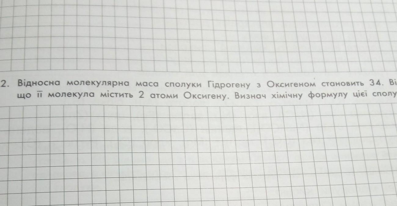 6.2. Відносна молекулярна маса сполуки Гідрогену з Оксигеном становить 34. Відомо, що її молекула містить 2 атоми Оксигену. Визнач хімічну формулу цієї сполуки.