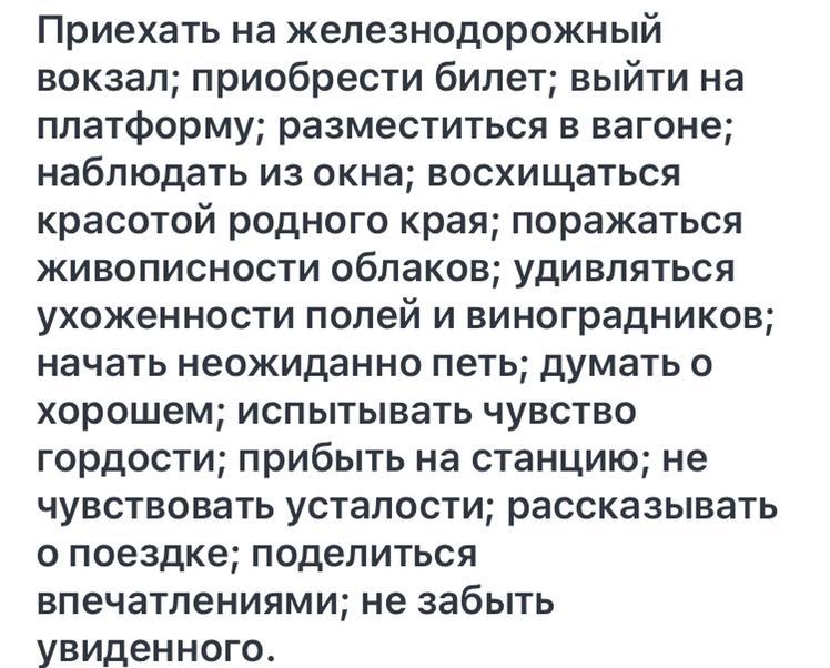 Приехать на железнодорожный вокзал; приобрести билет; выйти на платформу; разместиться в вагоне; наблюдать из окна; восхищаться красотой родного края; поражаться живописности облаков; удивляться ухоженности полей и виноградников; начать неожиданно петь; думать о хорошем; испытывать чувство гордости; прибыть на станцию; не чувствовать усталости; рассказывать о поездке; поделиться впечатлениями; не забыть увиденного.
