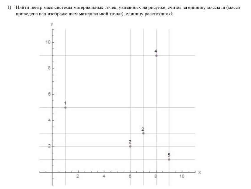Найти центр масс системы материальных точек, указанных на рисунке, считая за единицу массы m (масса приведена над изображением материальной точки), единицу расстояния d: