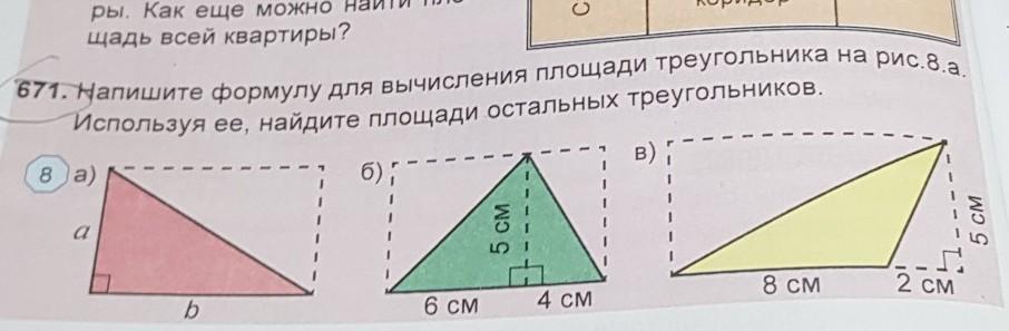 671. Напишите формулу для вычисления площади треугольника на рис.8.а. Используя ее, найдите площади остальных треугольников.